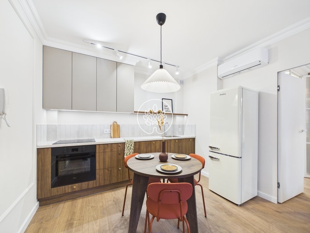 W każdym pomieszczeniu zabudowa meblowa wykonana na wymiar. Kuchnia wyposażona w komplet nowego AGD — płyta indukcyjna, piekarnik, zmywarka, lodówka. Do tego klimatyzacja, jasne okna wychodzące na dwie strony świata i ekspozycja słoneczna przez cały dzień.