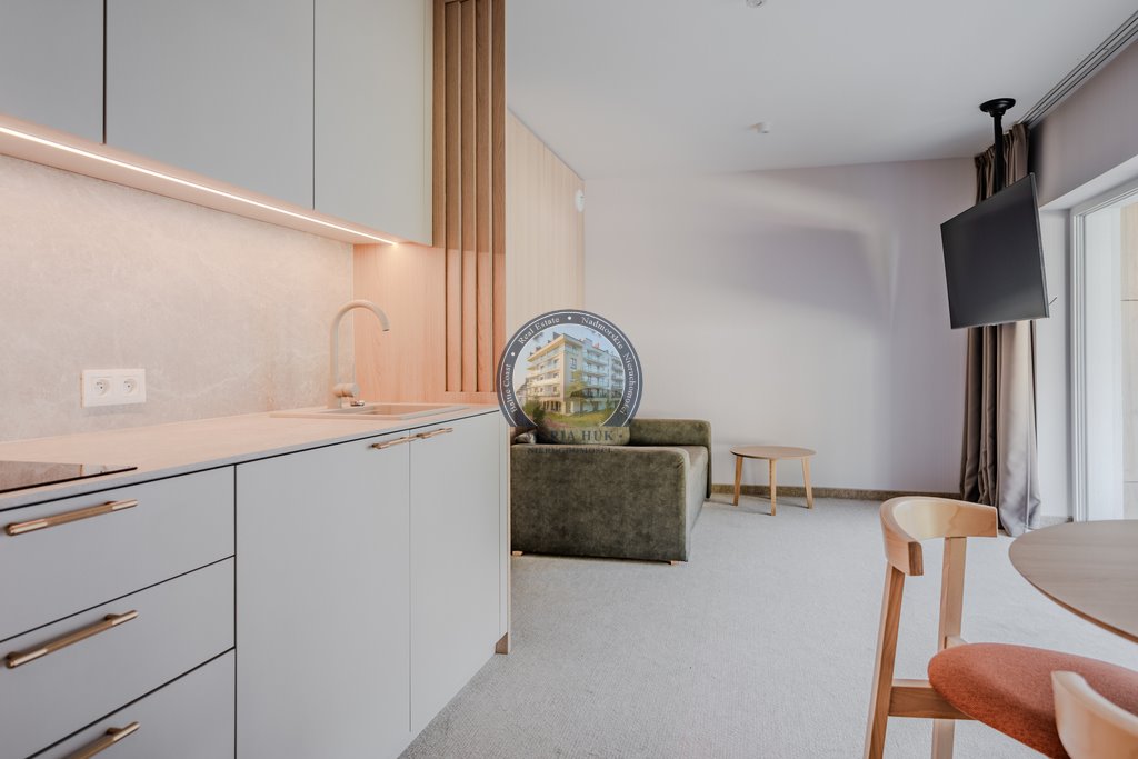 Sypialnia połączona z aneksem kuchennym, łazienka i osobno wnęka na pralkę i garderobę. Klimatyzacja z ogrzewaniem na pompę ciepła. Przestronny, przeszklony balkon z widokiem na las i przedzierające się morze między drzewami. Do tego klamki na zamek z kodem na panelu elektronicznym.