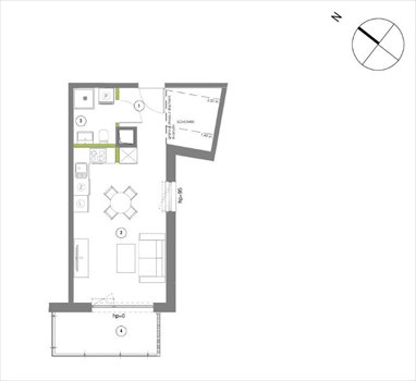 Wnętrze tworzy funkcjonalna strefa dzienna z aneksem kuchennym i wyjściem na prywatną część zewnętrzną, ustawna łazienka oraz wyjątkowy atut — praktyczny schowek/pomieszczenie gospodarcze przy wejściu. Duże przeszklenia zapewniają świetne doświetlenie i poczucie przestrzeni, a układ mieszkania daje szerokie możliwości aranżacyjne.