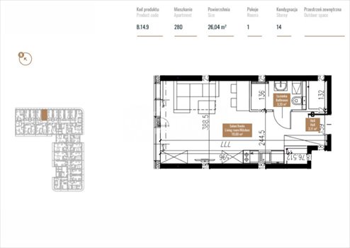 Mieszkanie 280 znajduje się na 14 piętrze, ma ponad 25m2 i składa się z salonu z aneksem kuchennym, łazienki i przedpokoju. Mieszkanie posiada klimatyzację.
