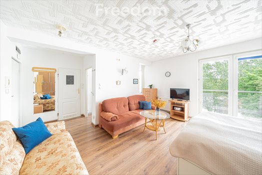 Apartament składa się z dużego pokoju z aneksem kuchennym oddzielonym ścianą, przedpokoju oraz łazienki . Kompletnie umeblowany i wyposażony - całość pozostaje w cenie nieruchomości. W salonie duża szafa w zabudowie. Łazienka wyposażona w kabinę prysznicową, umywalkę oraz wc. Duży balkon usytuowany na wschodnio-południową stronę.