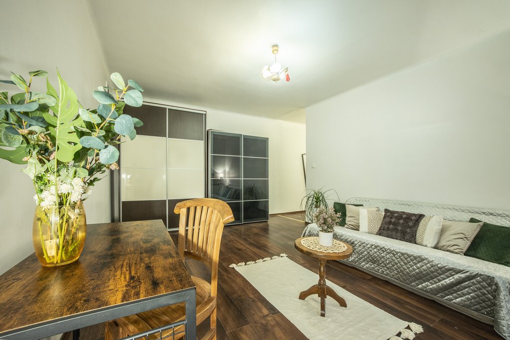 Mieszkanie posiada ustawny pokój, w którym bez problemu zmieścisz wygodną strefę dzienną i miejsce do pracy lub relaksu.