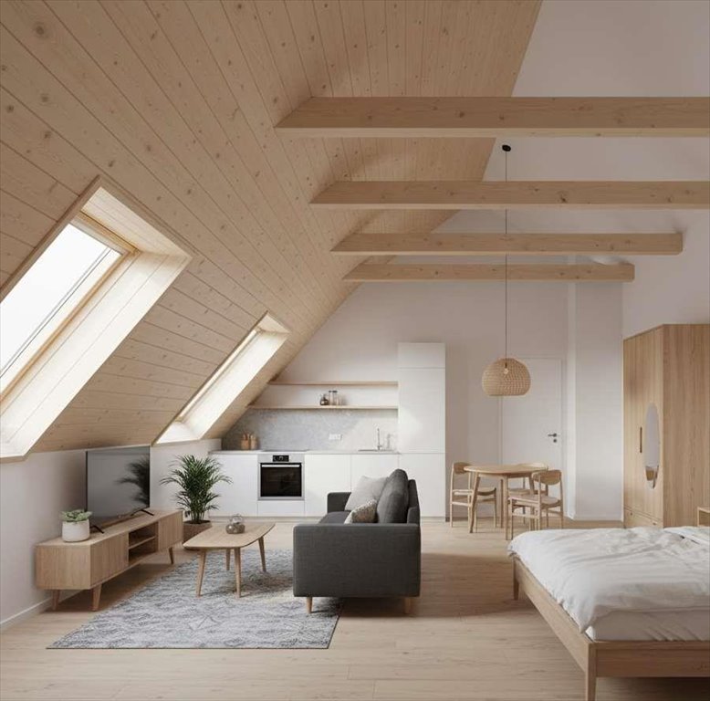Oferowany lokal położony jest na poddaszu i ma powierzchnię po podłodze ok. 23 m2.
