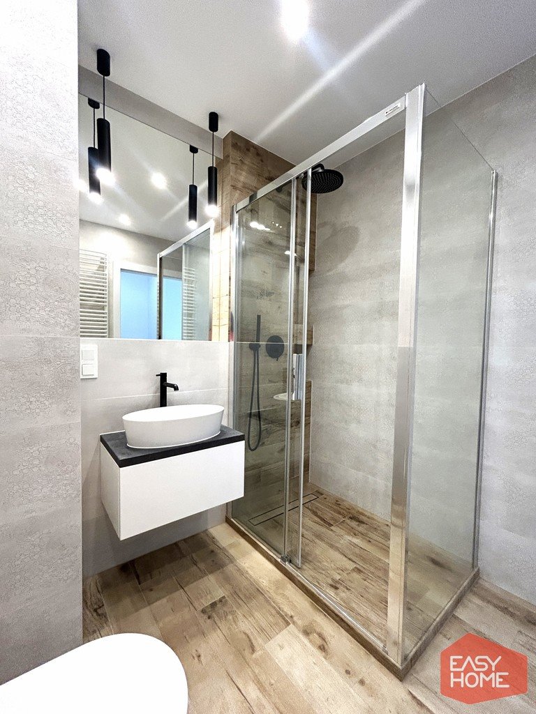 W łazience mamy kabinę prysznicową, umywalkę z szafką, podwieszany sedes oraz lustro łazienkowe, w korytarzu wieszak i półka na buty.