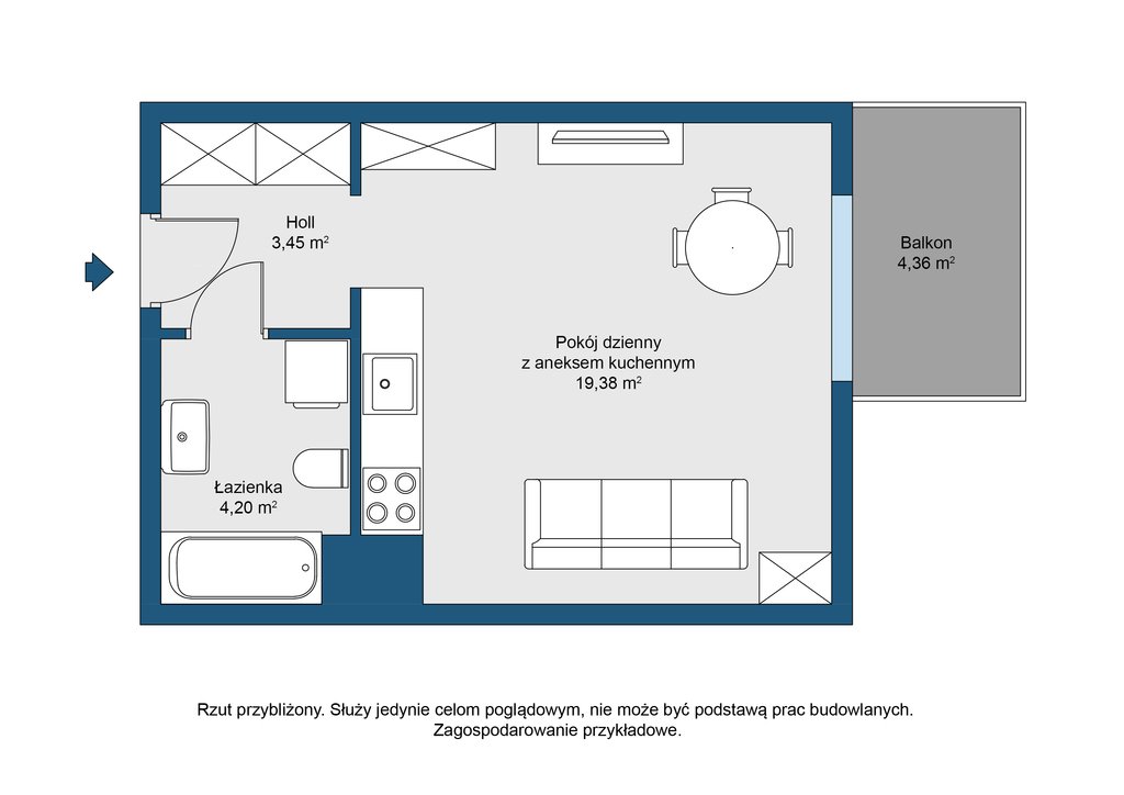 Mieszkanie o powierzchni 27,08 m² znajduje się na 2. piętrze nowoczesnego budynku apartamentowego z 2024 r. i składa się z: