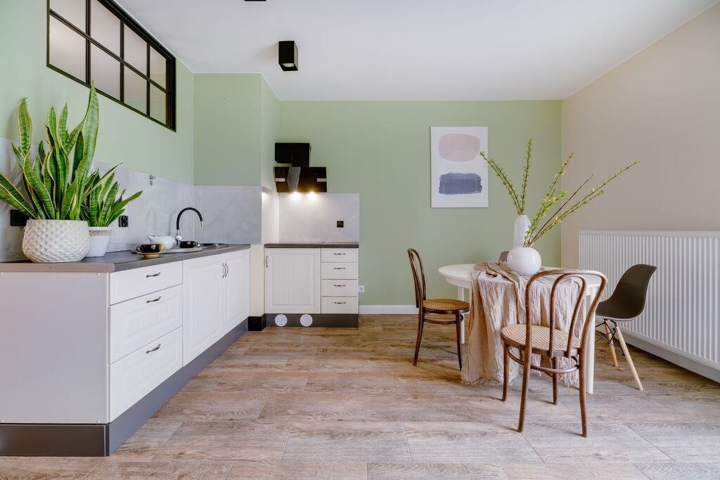 Sercem mieszkania jest salon z aneksem kuchennym, stanowiący główną przestrzeń dzienną. To jasne i funkcjonalne wnętrze z bezpośrednim wyjściem do ogrodu, dobrze doświetlone dzięki dużym przeszkleniom, zapewniające miejsce zarówno na strefę wypoczynkową, jak i jadalnianą.