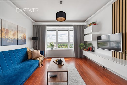 salon z panoramicznym oknem ( widok na panoramę Warszawy),