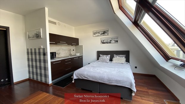 Komfortowe, jednopokojowe mieszkanie przy Rynku w budynku z 2009r. z recepcją, monitoringiem i ochroną. Mieszkanie składa się z: pokoju z aneksem kuchennym, łazienki i dużego przedpokoju. Powierzchnia po podłodze 34,4 mkw, ze względu na skos powierzchnia użytkowa wynosi 31mkw. Najwyższy standard wykończenia: kamień, szkło, drewno merbau, granit, w łazience armatura Villeroy & Bosch, blat z granitu.