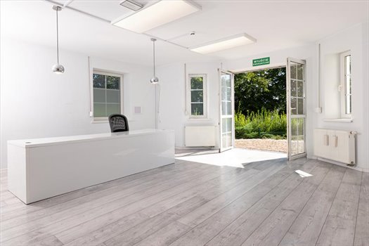 parter: recepcja/poczekalnia (pow. 31 m2) z wyjściem na taras i do ogrodu, dwa gabunety o pow. 16 i 43 m2, hol, toaleta