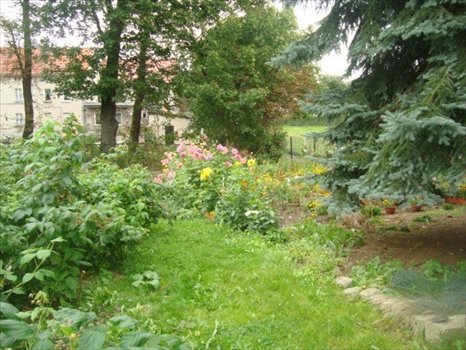 Ogród rekreacyjny i ozdobny, ogród warzywny ze szklarnią i plantacją malin i truskawek i 4 ha łąk przeznaczone na wypas dla koni.
