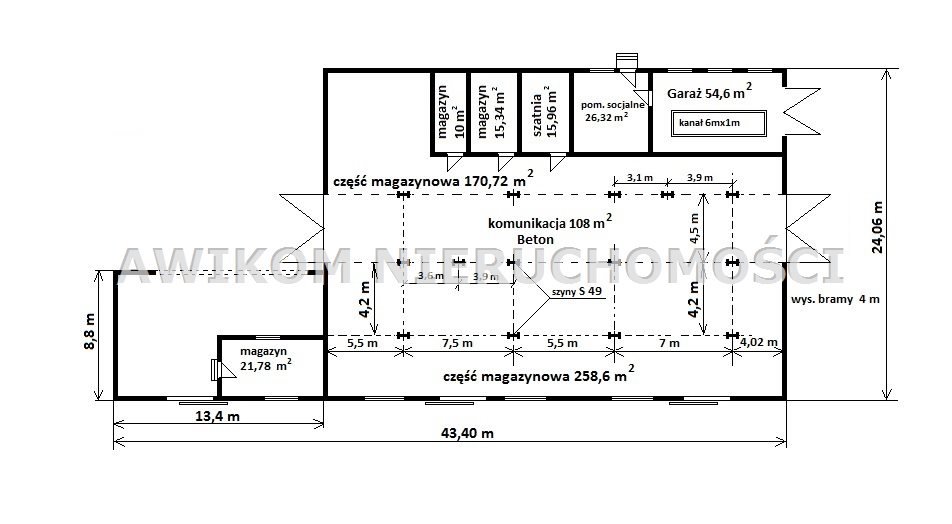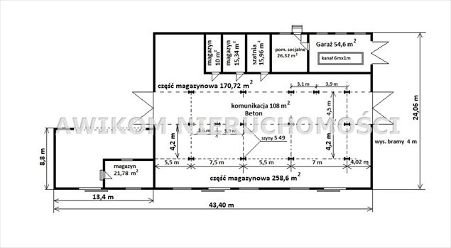 Działka inwestycyjno- produkcyjna. Można na działce pobudować dowolny obiekt przemysłowo-magazynowy. Transformator własny na działce pozwala na bezzwłoczne (bez oczekiwania na decyzję zakładu energetycznego) przyłączenie nowo wybudowanych obiektów. Własna studnia głębinowa i dostęp do sieci wodociągowej. Na działce stoją: wiata magazynowo - produkcyjna, dom - biuro z zapleczem socjalnym, sypialniami dla pracowników, oraz szambo ekologiczne. Te wszystkie naniesienia, czynią tę działkę bardzo tanią w przystosowaniu do własnych potrzeb.