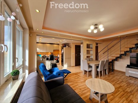 Mieszkanie zostało zaprojektowane z myślą o wygodzie i komforcie mieszkańców. Dół kondygnacji składa się z bardzo jasnego i przestronnego salonu z wyjściem na duży balkon, podzielonego na strefę relaksu z wygodną sofą, stolikiem kawowym, komodą oraz szafką RTV oraz strefę jadalnianą z sześcioosobowym stołem. Salon połączony jest z otwartą i funkcjonalnie zaprojektowaną kuchnią z meblami AGD w zabudowie, lodówką, zmywarką, piekarnikiem, płytą i okapem. Na dole znajduje się również toaleta. Na drugiej kondygnacji mieszkania znajdują się trzy sypialnie. Pierwsza z nich jest z wyjściem na drugi również duży balkon, wyposażona jest w kanapę z funkcją spania oraz dużą funkcjonalną komodę. Druga sypialnia jest widna i bardzo ustawna. Wyposażona jest w łóżko dziewczęce, pojemną szafę narożną, biurko oraz regał. W trzeciej sypialni znajduje się duże łóżko sypialniane, lustrzana trzydrzwiowa szafa, dwie komody oraz szafka nocna. N górze znajduje się również łazienki z toaletą, prysznicem wyposażona w pralkę, hol łączący pokoje w górnej części mieszkania, schody łączące kondygnacje.