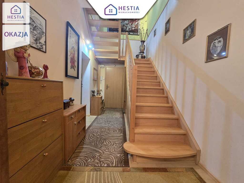 Budynek w którym znajduje się mieszkanie jest dobrze utrzymany, zadbany i czysty. Wymieniony został dach. W mieszkaniu na piętrze, wstawione są drewniane okna połaciowe marki Velux z markizami zewnętrznymi. W pozostałych pomieszczeniach są okna PCV. Na podłogach w mieszkaniu ułożone są panele oraz terakota, na ścianach położona jest gładź. W całym mieszkaniu została wymieniona instalacja elektryczna na miedzianą. Na ścianach mamy gładź. Ogrzewanie i ciepła woda jest z sieci miejskiej. W mieszkaniu nie ma gazu. Pomieszczenia w mieszkaniu są duże, przestronne i wysokie na 3 m. Na piętro prowadzą eleganckie, drewniane schody, które dodają uroku całemu wnętrzu. Kuchnia z meblami w zabudowie oraz sprzętem AGD, stworzona jest z myślą o wygodzie gotowania i wspólnych posiłkach.