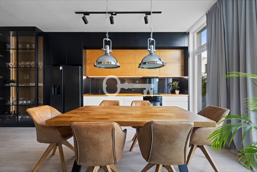 Spacious interiors, plenty of light, tall door wings as a backdrop for modernist forms, the combination of wood with stone - these are the components of this unique interior. Large glazing in the living room guarantees a view of the sunny terrace from which we can admire the sunsets. A modern fully finished terraced house with a total area of 143 m2, located in the prestigious Merano Park development. The property is intended for people who value peace and quiet while still being close to the urban agglomeration. For residents’ safety, monitoring, a video intercom, and a remotely operated entrance gate have been installed. A double garage and two additional parking spaces in front of the garage are certainly not the only advantages of this property.