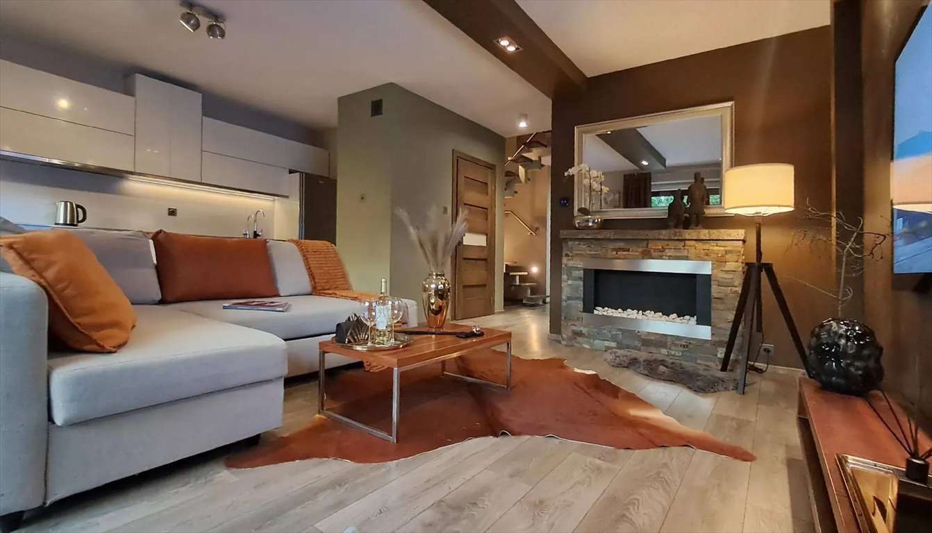 Apartament został zaprojektowany przez architekta, każdy element, od drzwi po szafy, schody i meble, wykonany jest z naturalnych, szczegółowo dobranych materiałów, stworzony na zamówienie, co podkreśla jego unikalny charakter. W salonie znajduje się przytulny kominek, który robi wyjątkową atmosferę jak również skutecznie potrafił nagrzać mieszkanie paląc się prawdziwym ogniem. Nowoczesne rolety antywłamaniowe sterowane pilotem oraz system alarmowy z czujkami ruchu zapewniają pełne bezpieczeństwo. Do apartamentu przynależy garaż pod budynkiem, co zapewnia duży komfort.