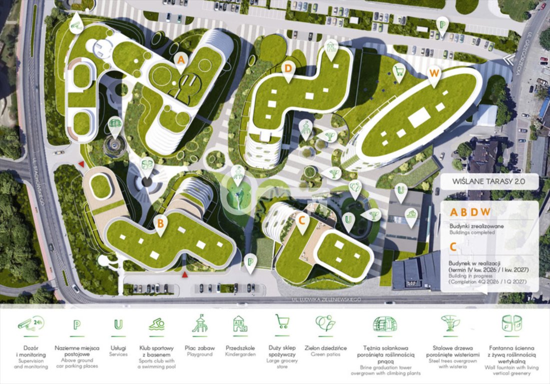 Wiślane Tarasy 2.0 is more than just a housing estate - it is a modern urban concept that harmoniously combines futuristic architecture, nature and the history of Krakow. Located between Stachowskiego and Grzegórzecka Streets, the development offers direct proximity to the Vistula River and a unique microclimate created by vertical gardens inspired by Singapore's ‘Sky Forest’.