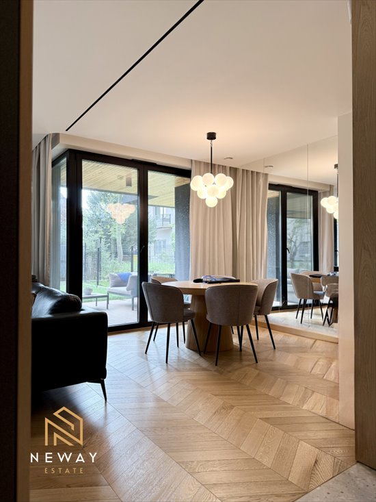 Na dole część dzienna: salon z dużymi oknami i wyjściem na ogród, kuchnia wykonana na wymiar, łazienka z prysznicem. Schody prowadzą na piętro — trzy ustawne sypialnie i druga łazienka z wanną. Wysokość pomieszczeń 2,75 m daje oddech. Ogród ok. 135 m² pozwala żyć „na zewnątrz” przez większą część roku. To mieszkanie, które działa w codzienności: przestrzeń do pracy, miejsce na wspólny stół, dużo światła.