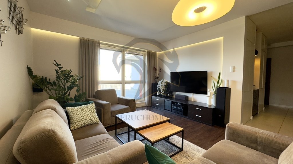 Salon – stylowo urządzony, wyposażony w eleganckie sofy, szafkę RTV oraz telewizor. Otwarta przestrzeń z bezpośrednim wyjściem na duży taras o powierzchni 23,78 m², który aktualnie jest w trakcie wykańczania.