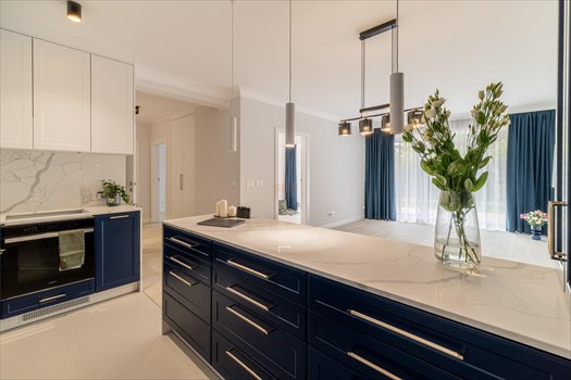 W apartamencie wyraźnie wydzielono strefę sypialną dla właściciela lub jego gości, wraz z oddzielną, dedykowaną łazienką. Wykończenie mieszkania odznacza się wysokim standardem, obejmującym gładzie, podłogi, ozdobne listwy przysufitowe, drzwi wewnętrzne oraz kuchnię wykonaną na indywidualne zamówienie z blatami z konglomeratu.