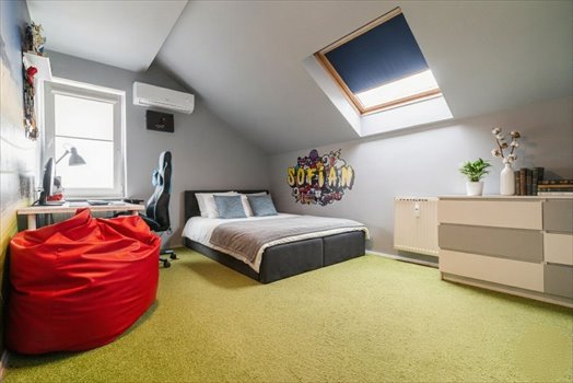 Góra (Strefa prywatna): Gdy dom dorośleje, a Ty potrzebujesz ciszy, udajesz się na piętro. Znajdziesz tu dwie komfortowe sypialnie, w tym jedną z klimatyzacją, która uratuje Cię w upalne letnie noce. Do tego przestronna łazienka z wanną oraz garderoba – koniec z wielkimi szafami zajmującymi miejsce w pokojach!
