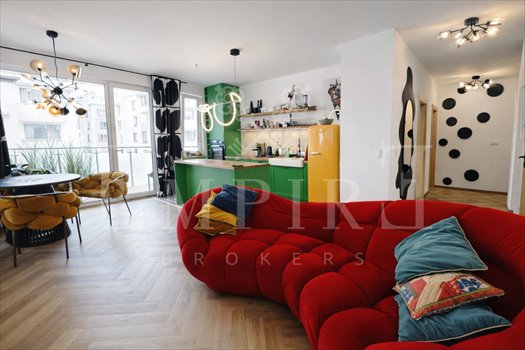 W mieszkaniu znajdują się drewniane podłogi oraz wysokiej jakości sprzęty AGD marki SMEG, co podkreśla jego nowoczesny i elegancki charakter.