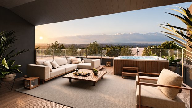 - Atut: Mieszkania na piętrze posiadać będą duże, widokowe tarasy, które stanowią idealne miejsce do wypoczynku z panoramą okolicy w tle. Dodatkowo strop został odpowiednio wzmocniony, aby umożliwić bezpieczny montaż jacuzzi, co pozwala na stworzenie prywatnej strefy relaksu na świeżym powietrzu.