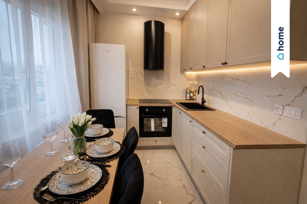- Kuchnia w nowej zabudowie wraz ze sprzętem AGD (lodówka, zmywarka, piekarnik, płyta indukcyjna, okap – wszystko na gwarancji),