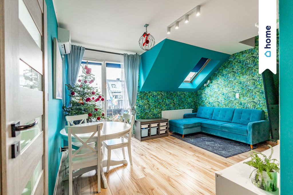 Na pierwszym poziomie mieszkania znajduje się pokój dzienny wraz z aneksem kuchennym i wyjściem na balkon, sypialnia, łazienka oraz przedpokój. Na drugi poziom mieszkania prowadzą drewniane schody gdzie znajduje się gabinet, sypialnia oraz mały przedpokój ze schowkiem.