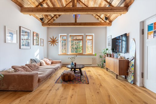 Pokój dzienny jest jedną z najmocniejszych stron całej nieruchomości. Wysoki na ponad cztery i pół metra , z widoczną konstrukcją dachu, drewnianymi belkami i dużą ilością naturalnego światła, zachwyca od pierwszego spojrzenia. Z pierwszego poziomu wychodzimy również na balkon oraz taras, które skierowane są na dwie zupełnie różne strony świata, co zapewnia światło o różnych porach dnia. Z części okien rozpościera się widok na pasmo Karkonoszy, a całości atmosfery dopełnia działający kominek.
