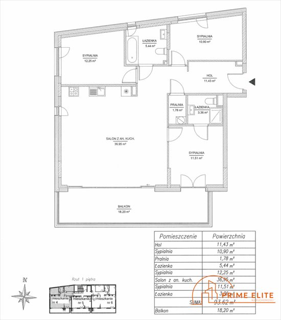 Mieszkanie jest w stanie deweloperskim i znajduje się na I piętrze (winda) i ma powierzchnię 93 m2.