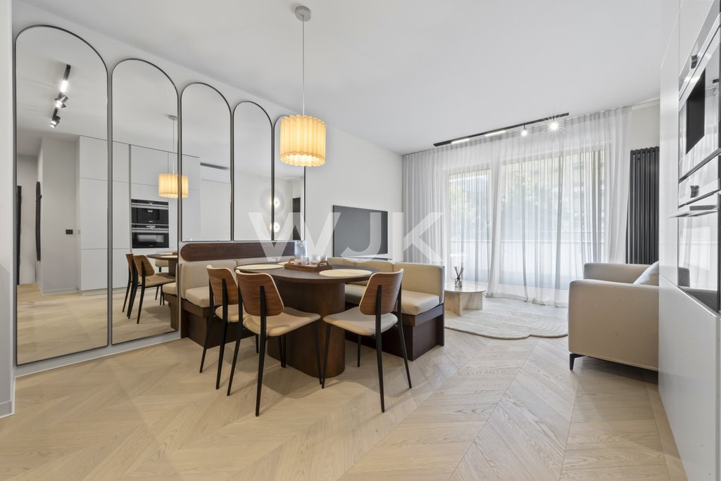 The apartment is located in one of the most desirable parts of Warsaw. This location perfectly combines the comfort of city living with a sense of privacy and space.