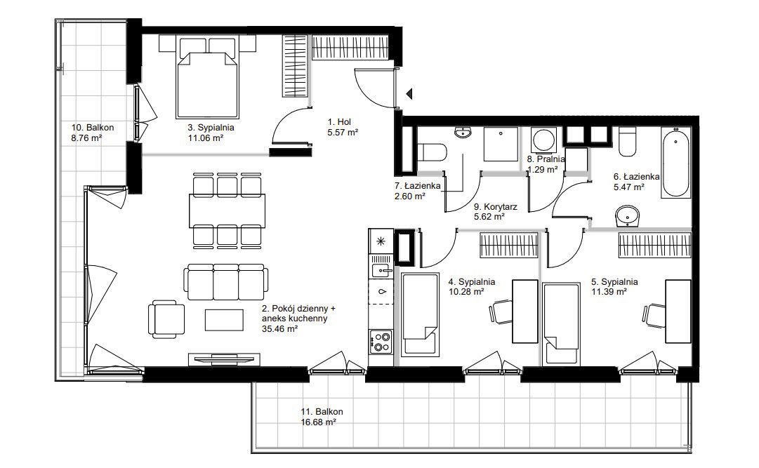Apartament o powierzchni około 88,74 m2 z dwoma balkonami (16,68m2 oraz 8,76m2),