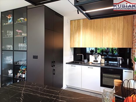 Zabudowa kuchenna pod wymiar (częściowo drewniane fronty) w pełni wyposażona w sprzęty AGD (lodówka i zmywarka, płyta indukcyjna, piekarnik, okap).