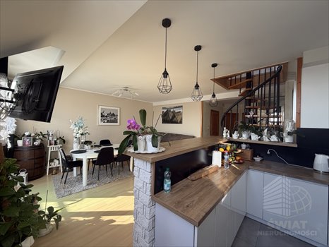 Przemyślany układ dwóch poziomów : Poziom dolny stanowi funkcjonalną, dzienną część mieszkania. Znajduje się tu: