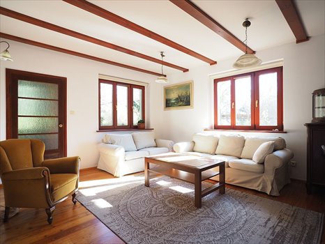 W pokojach stylowe drewniane meble wolnostojące, dwie sofy, łóżko, dwie duże szafy w zabudowie. Na podłogach deski sosnowe, w przedpokoju, kuchni i łazience gres. Oryginalna drewniana stolarka drzwiowa, okna wymienione (drewniane). W sypialni klimatyzacja