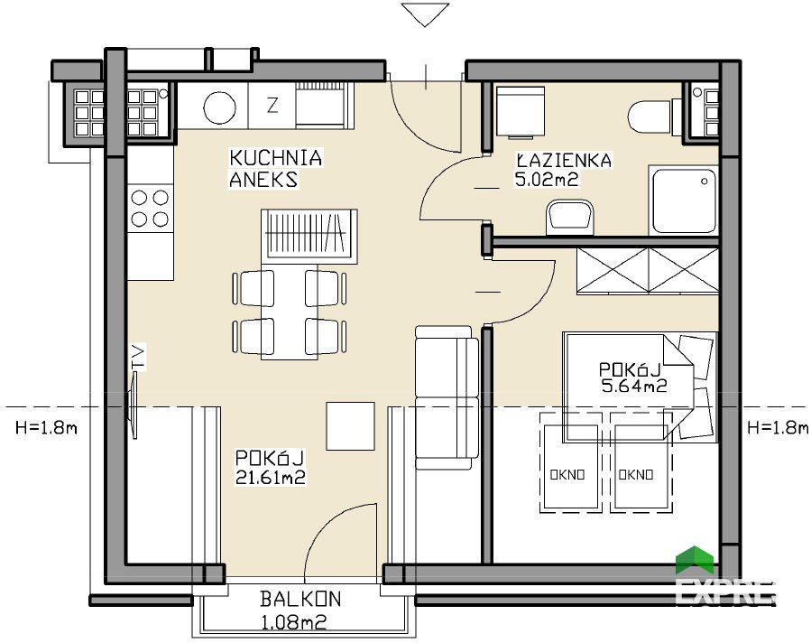 Na powierzchni 32.27 m2 znajdują się: kuchnia z aneksem, dwie sypialnie i łazienka.