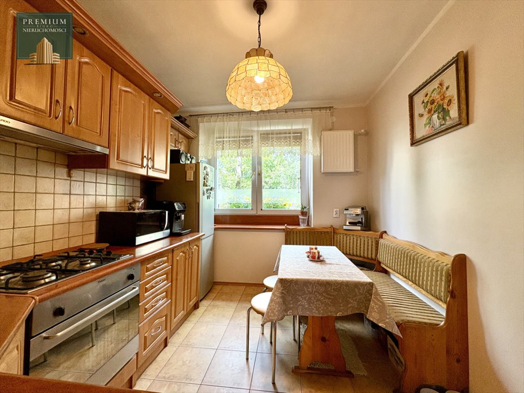Wyposażenie to zabudowa kuchni robiona na wymiar z pełnym AGD ( lodówka, piekarnik, okap), zabudowy w przedpokoju i sypialni.