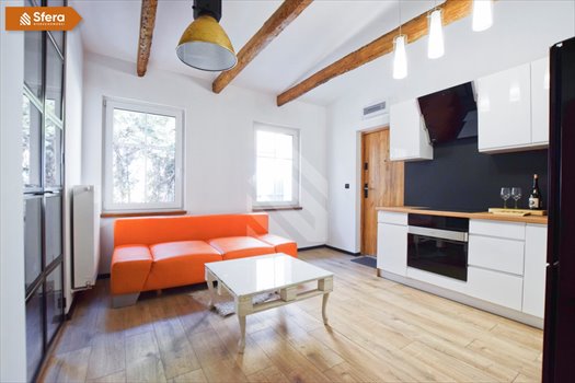 Mieszkanie utrzymane w spójnej stylistyce o charakterze industrialnym. Salon z aneksem kuchennym zachwyca asymetrycznym sufitem z dekoracyjnymi belkami oraz dopasowanym oświetleniem. Ponadto uwagę przyciągają rozpościerające się po sam sufit przeszkolone dwuskrzydłowe drzwi do sypialni.