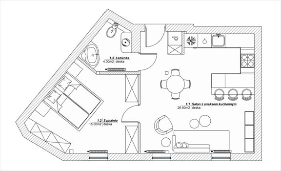 - Proponujemy funkcjonalny układ: salon z aneksem kuchennym + sypialnia + łazienka