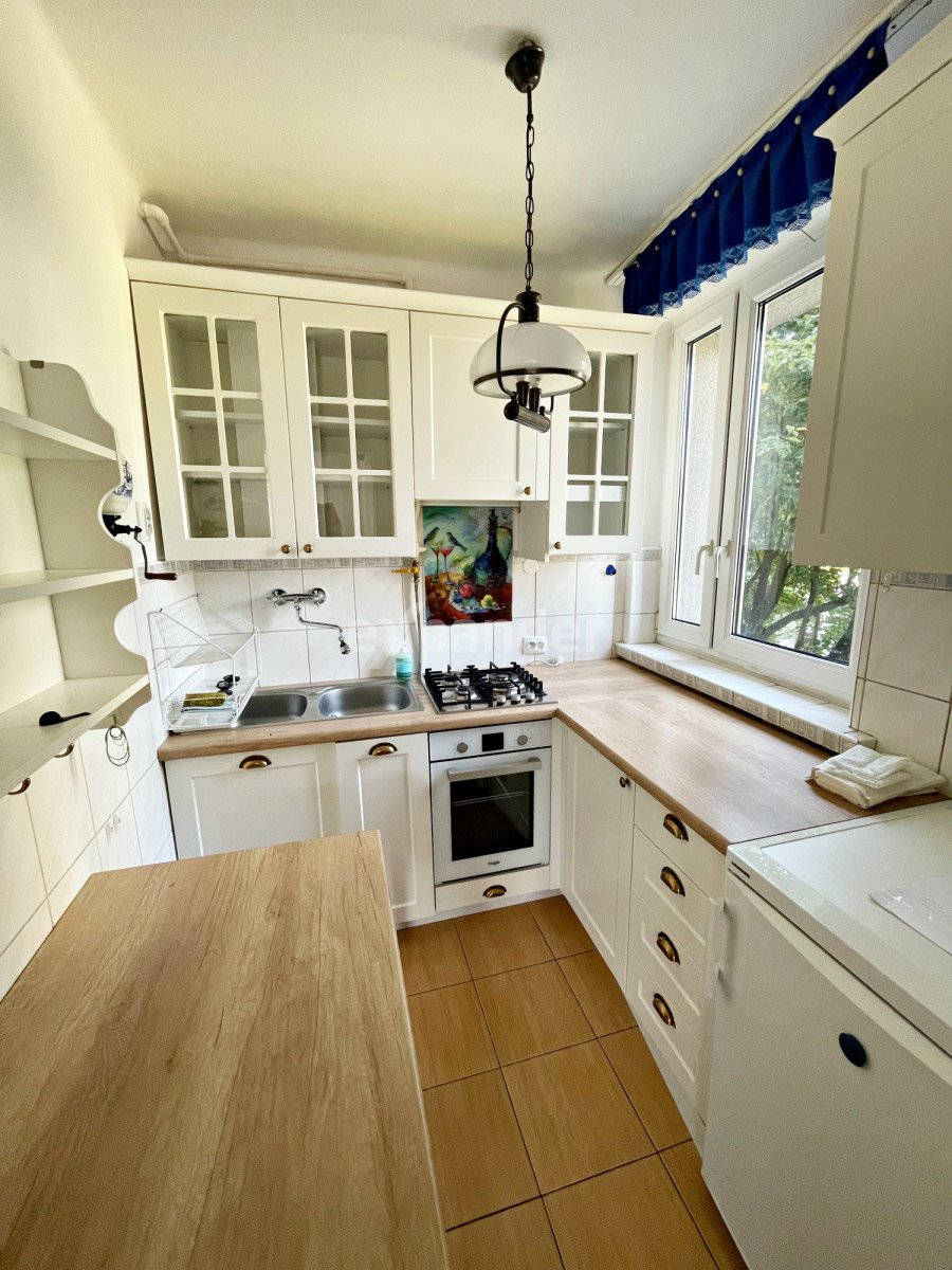 Osobna kuchnia z oknem - nowa zabudowa (3-letnia) z opuszczanymi szafkami na systemie windy, płyta gazowa, piekarnik i lodówka