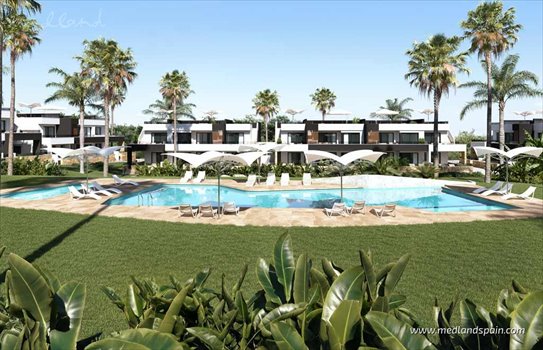 New apartment complex in the popular residential area of Ciudad Quesada on the Costa Blanca South. An ideal location, only 10 minutes’ drive from the fantastic beaches of Guardamar and La Mata, as well as a wide range of daily necessities, like large supermarkets, bars and restaurants, local and international schools, a medical centre and more. The area also offers a large selection of outdoor activities, with 4 prestigious golf courses within a 20-minute radius, municipal sports facilities, and tennis and padel courts, as well as hiking and cycling routes around the Salt Lagoon of the La Mata Natural Park. The complex is well connected by road, allowing for quick access to other tourist areas, like Torrevieja and Orihuela Costa, as well as the Alicante airport which is only 40 minutes away by car.The complex comprises 13 apartment blocks, surrounding the central communal pool and landscaped gardens with natural grass and palm trees. Each block includes apartments with 2 bedrooms and 2 bathrooms, available on the ground floor with a spacious terrace, or on the top floor with a private solarium and panoramic views of the area. All apartments present an open plan living area, combining the kitchen, the dining area and lounge in a single space, with windows that open onto a terrace. As a special promotion, these apartments are sold fully furnished, including ducted A/C, white goods, complete bathrooms with underfloor heating, electric blinds, fitted wardrobes, and a parking space.