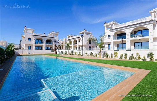New apartment complex in Ciudad Quesada, a residential area between Torrevieja and Guardamar, which has a wide range of services and facilities. It has a golf course, water park, hotels and a wide range of entertainment facilities and restaurants. And only 10 minutes’ drive from the fabulous beaches of Guardamar and Torrevieja. The area's access to the A-7 motorway makes it easy to connect to all the cities in the area, as well as Alicante airport, which is only 30 minutes away by car.The complex offers modern, ground floor apartments with 2 bedrooms. All apartments have a very bright open-plan living room. Depending on their location within the complex, some apartments can be accessed directly from the road, while others from internal walkways. All apartments include a parking space.This is a private and closed complex with a wonderful communal pool surrounded by an area for relaxing in the sun and large gardens.