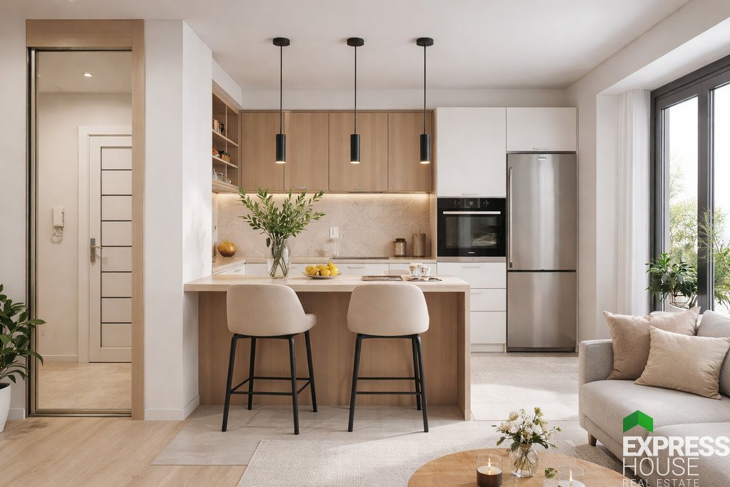 >> Вітальня з відкритою великою кухнею (наразі буфет демонтований)