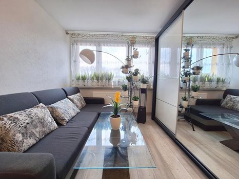 Wnętrze zostało wykończone w neutralnym stylu, w salonie i sypialni położono panele, w kuchni i korytarzu płytki, ściany zostały odmalowane, a mieszkanie wyposażono w meble oraz pojemne szafy z drzwiami przesuwnymi. Lokal sprzedawany jest z umeblowaniem, dzięki czemu może być gotowy do zamieszkania bez dodatkowych nakładów.