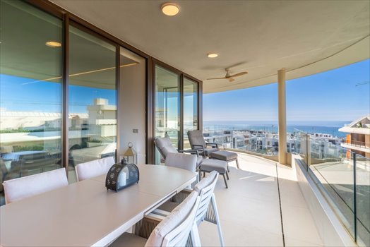 This bright corner apartment has spacious 42 sqm wraparound terrace with sun exposure from southeast to southwest. Both bedrooms enjoy unobstructed sea views, while the living room offers a stunning outlook over the mountains.