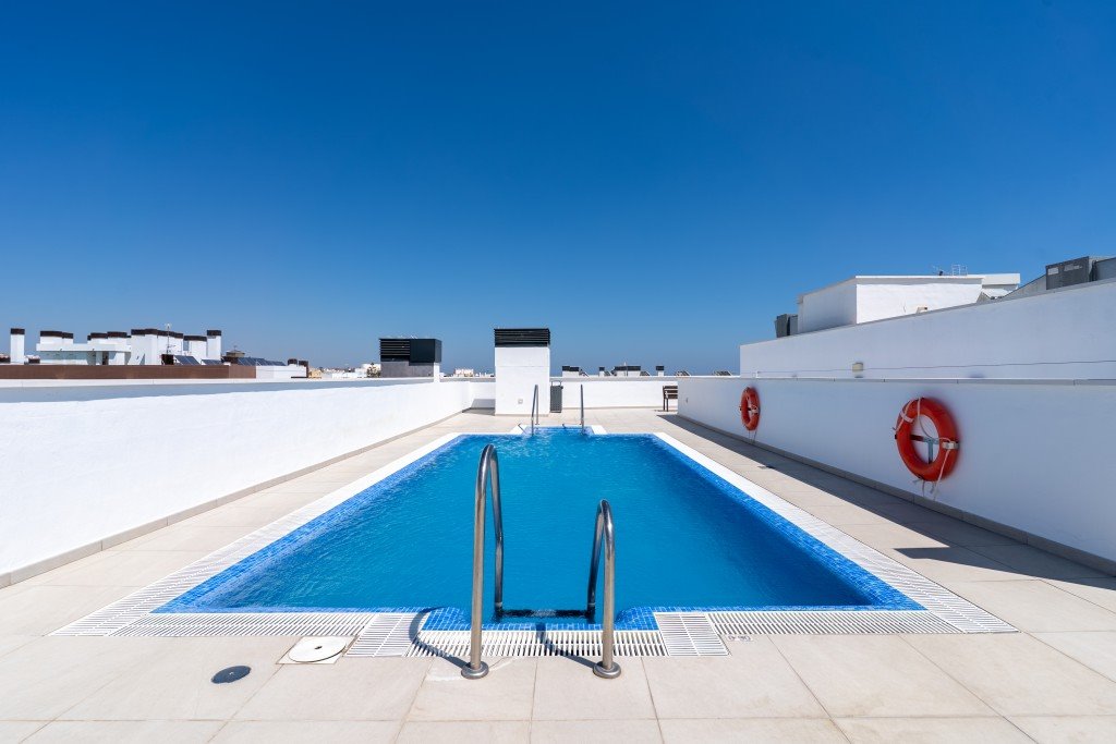 The building has a spectacular swimming pool on the rooftop, from where you can enjoy beautiful sea views, creating a unique environment to enjoy the privileged climate of the Costa del Sol all year round.