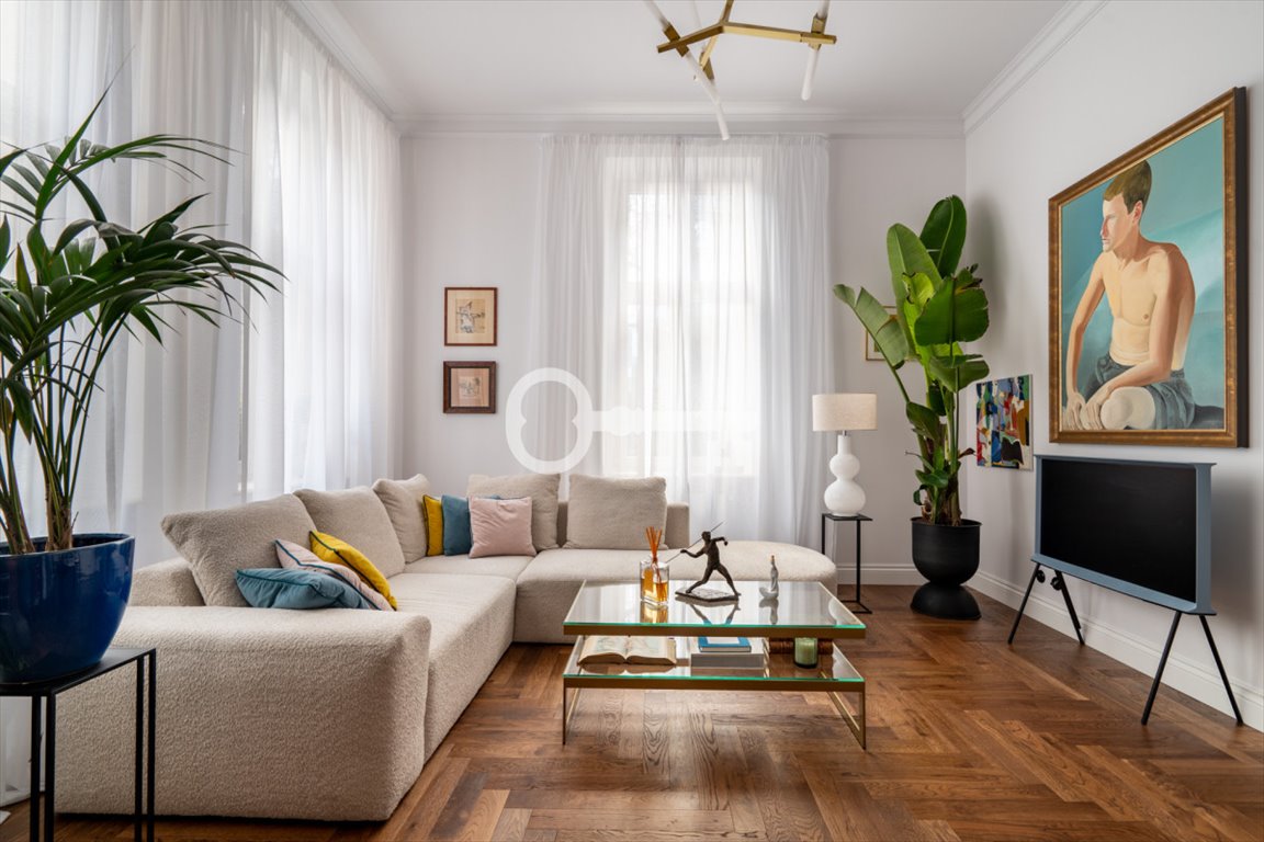 The room heights of 3.6 m, classic oak parquet flooring arranged in a herringbone pattern, and tall doors give the space a sense of nobility and timeless elegance. This apartment combines the building's history with a modern, functional design. The bright living room, with windows overlooking a green, well-maintained patio, provides peace, privacy, and a view of the greenery, a rare asset in the city center. This space promotes both relaxation and everyday comfort.