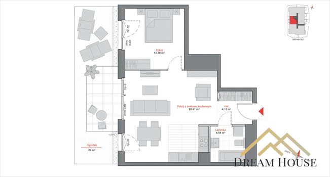 Apartament o powierzchni 50,07 m² zlokalizowany jest na parterze, z zachodnią ekspozycją. Salon z aneksem kuchennym (28,60 m²) otwiera się na ogródek o powierzchni 24,40 m², do którego prowadzą przesuwne drzwi balkonowe - to miejsce, które może stać się przedłużeniem strefy dziennej lub przestrzenią do wypoczynku po pracy. Układ wnętrza obejmuje także sypialnię (12,76 m²) i łazienkę (4,59 m²), co pozwala na wygodne rozplanowanie funkcji mieszkalnych.