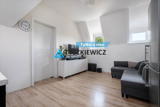 Przytulna kawalerka o łącznej powierzchni 33,5 m2 znajduje się na drugim piętrze dwupiętrowego budynku .