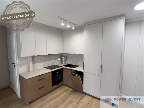 Kuchnia: nowa zabudowa na wymiar + nowe AGD (płyta, piekarnik, pochłaniacz, zmywarka) – wszystko na gwarancji, nieużywane.